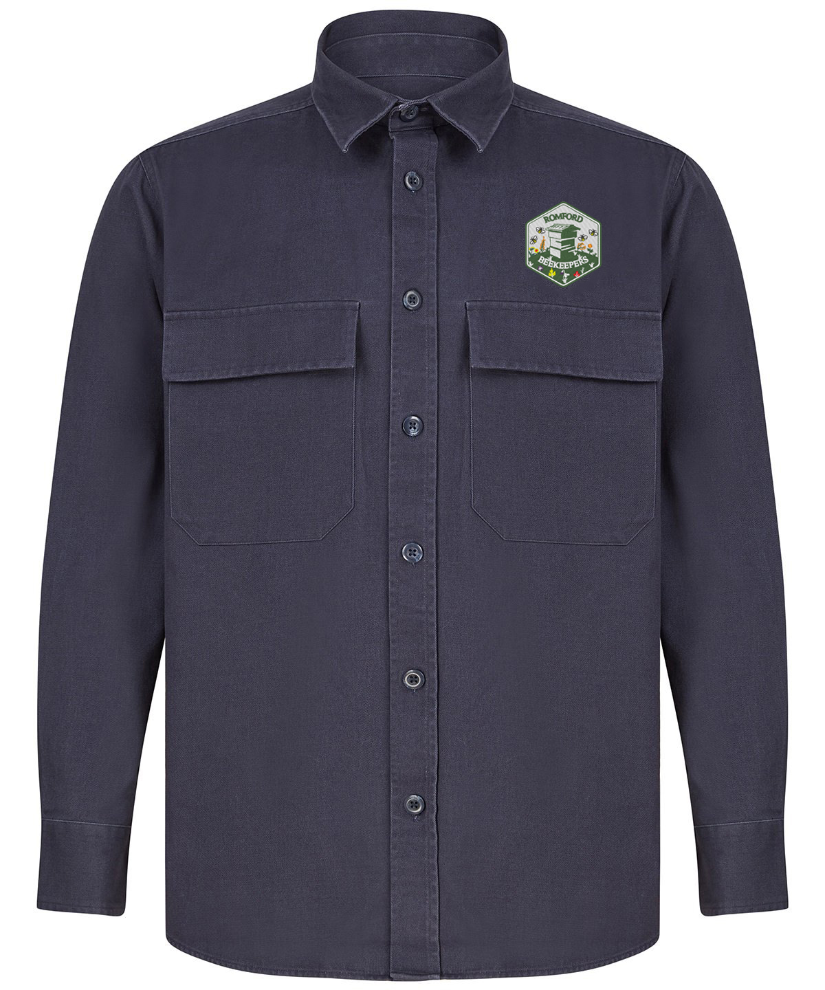 Heavyweight overshirt. Back yoke. Twin-needle topstitching. Plastic horn-effect buttons. Mitred patch pockets with flap. Mitred cuff and placket with button fastening. Curved hem. Forward shoulder seam.