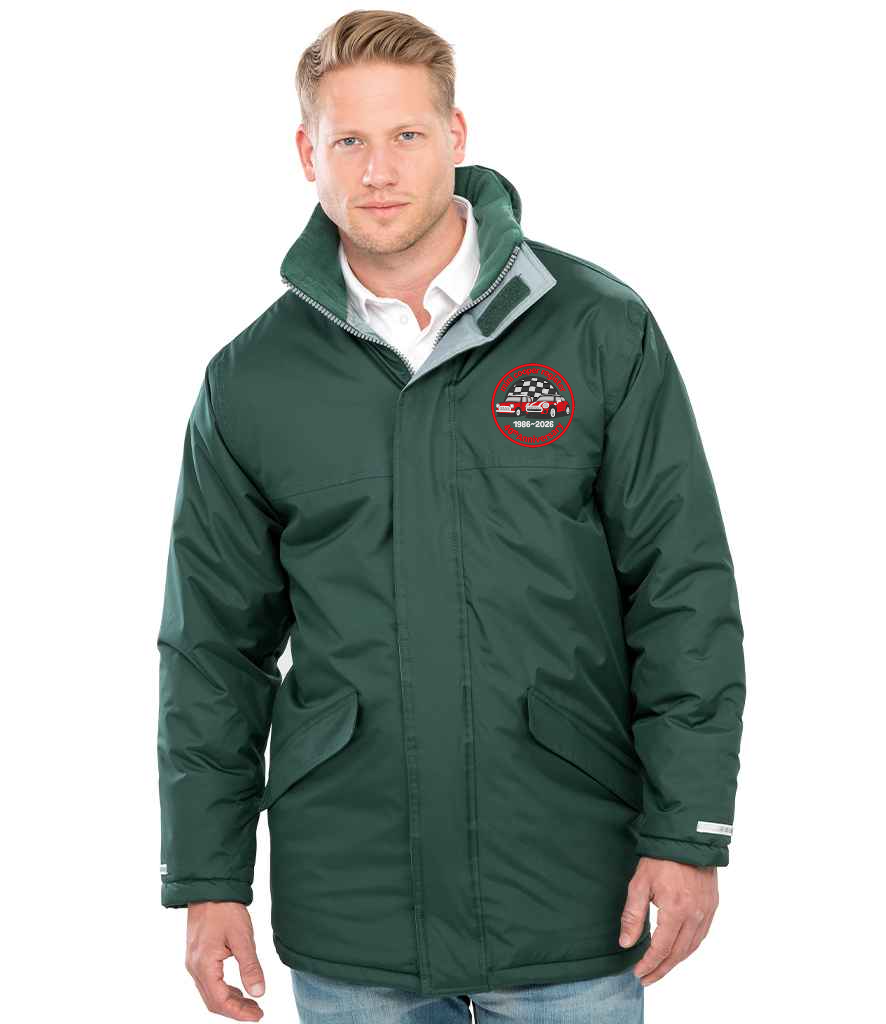 Waterproof-StormDri 2000. Windproof. Fully taped waterproof seams. Long fit. Super warm. Concealed 3-panel hood in collar. Full front heavy duty zip. 2 concealed front pockets with storm cover. Super warm fleece-lined collar. Reflective cuff and back detail. Name and class tag inside left pocket. Fleece-lined front pockets. Adjustable drawcord hem. Ready to brand cut cut-away label. Decorating methods: Embroidery, direct print, digital transfer print, and screen print transfer. Decorators access point: Full hem and left chest.