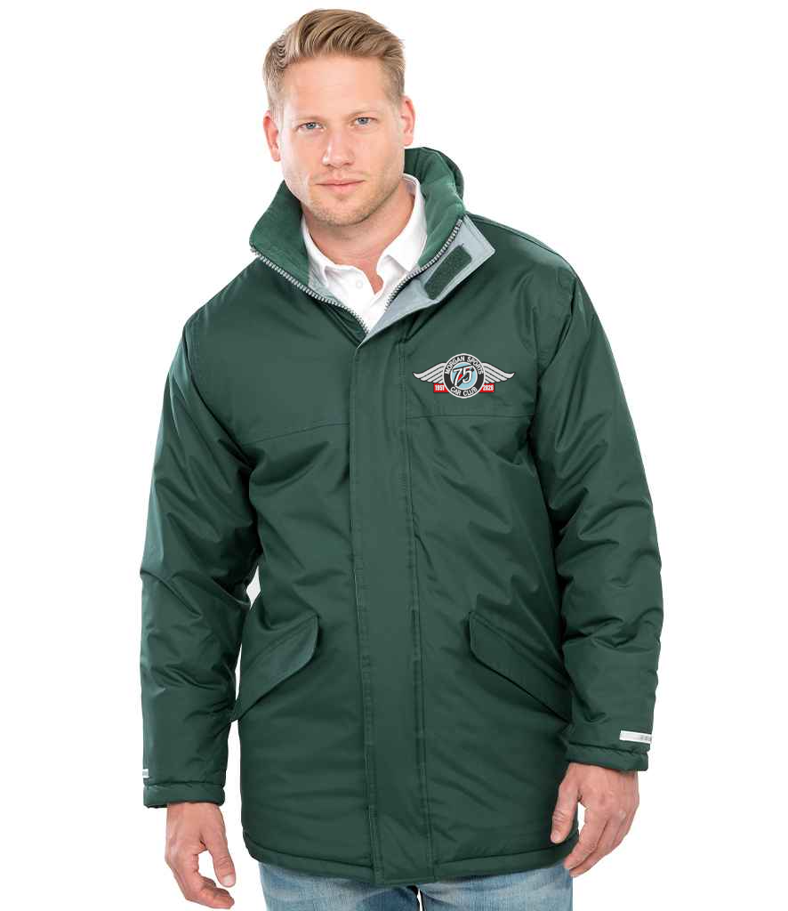 Waterproof-StormDri 2000. Windproof. Fully taped waterproof seams. Long fit. Super warm. Concealed 3-panel hood in collar. Full front heavy duty zip. 2 concealed front pockets with storm cover. Super warm fleece-lined collar. Reflective cuff and back detail. Name and class tag inside left pocket. Fleece-lined front pockets. Adjustable drawcord hem. Ready to brand cut cut-away label. Decorating methods: Embroidery, direct print, digital transfer print, and screen print transfer. Decorators access point: Full hem and left chest.