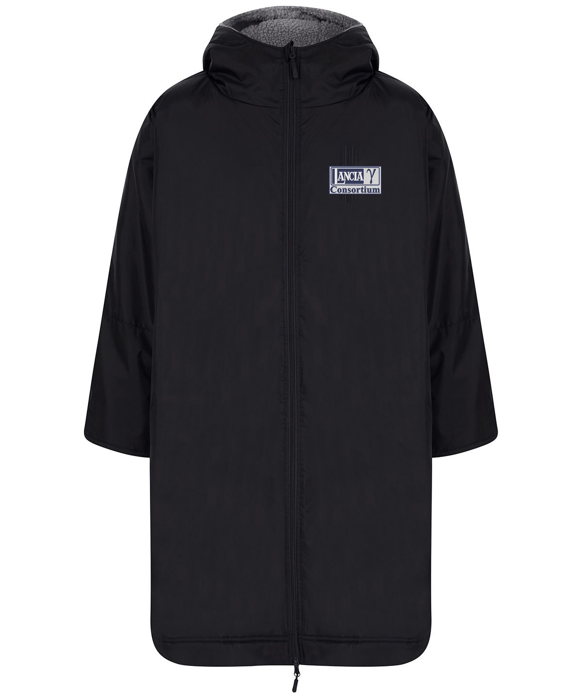 Water-resistant robe with sherpa fleece lining and a three-piece hood. Full double-ended zip down centre front. Zipped pockets with fleece lining. Inner zipped pocket with water-resistant lining. Inner embroidery access zip. Hook and loop fastening at wrist. Side vents. Certified BSCI.