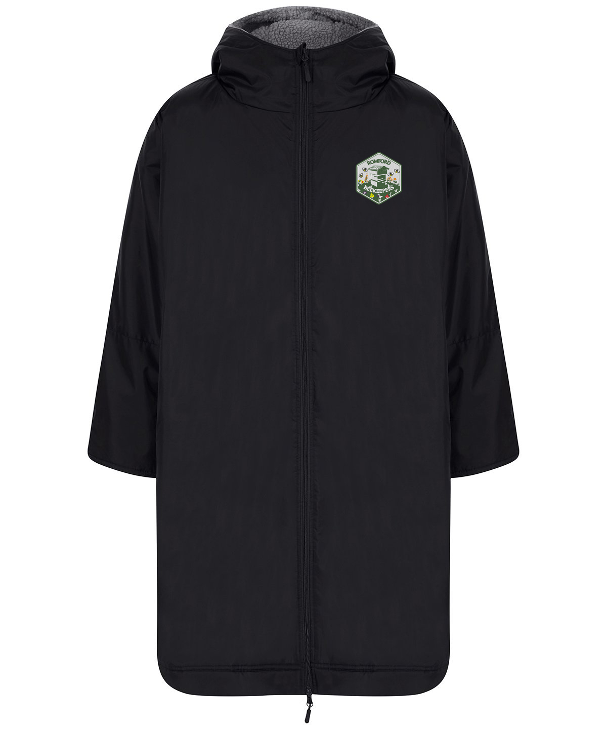 Water-resistant robe with sherpa fleece lining and a three-piece hood. Full double-ended zip down centre front. Zipped pockets with fleece lining. Inner zipped pocket with water-resistant lining. Inner embroidery access zip. Hook and loop fastening at wrist. Side vents. Certified BSCI.