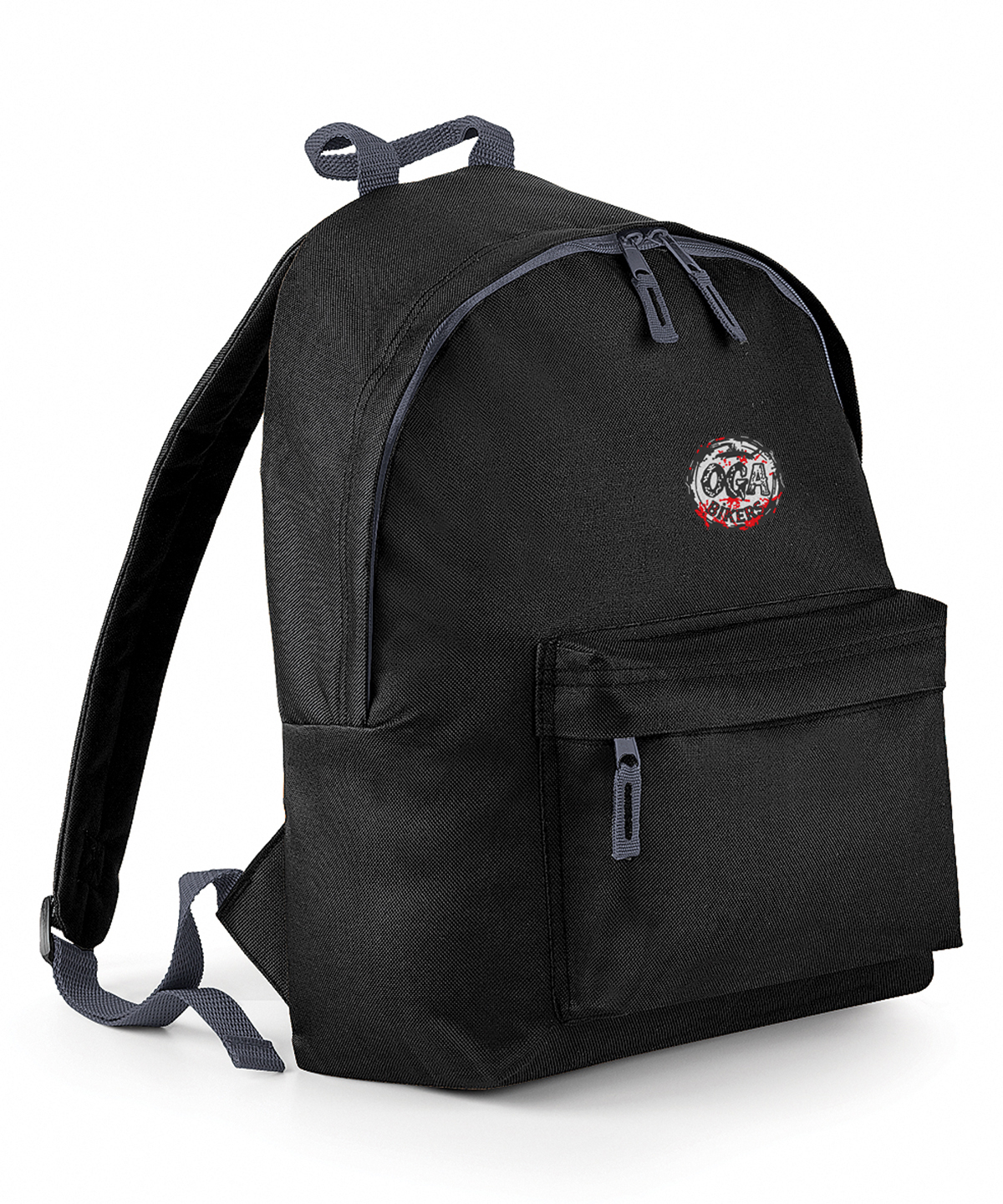Padded adjustable shoulder straps. Zippered front pocket. Padded back panel. Grab handle.