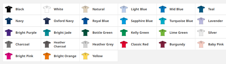 | Colour | Black, White, Natural, Light Blue, Mid Blue, Teal, Navy, Oxford Navy, Royal Blue, Sapphire Blue, Turquoise Blue, Lavender, Bright Purple, Bright Jade, Bottle Green, Kelly Green, Lime Green, Sliver, Charcoal, Heather Charcoal, Classic Red, Burgandy, Baby Pink, Bright Pink, Bright Orange, Yellow |
