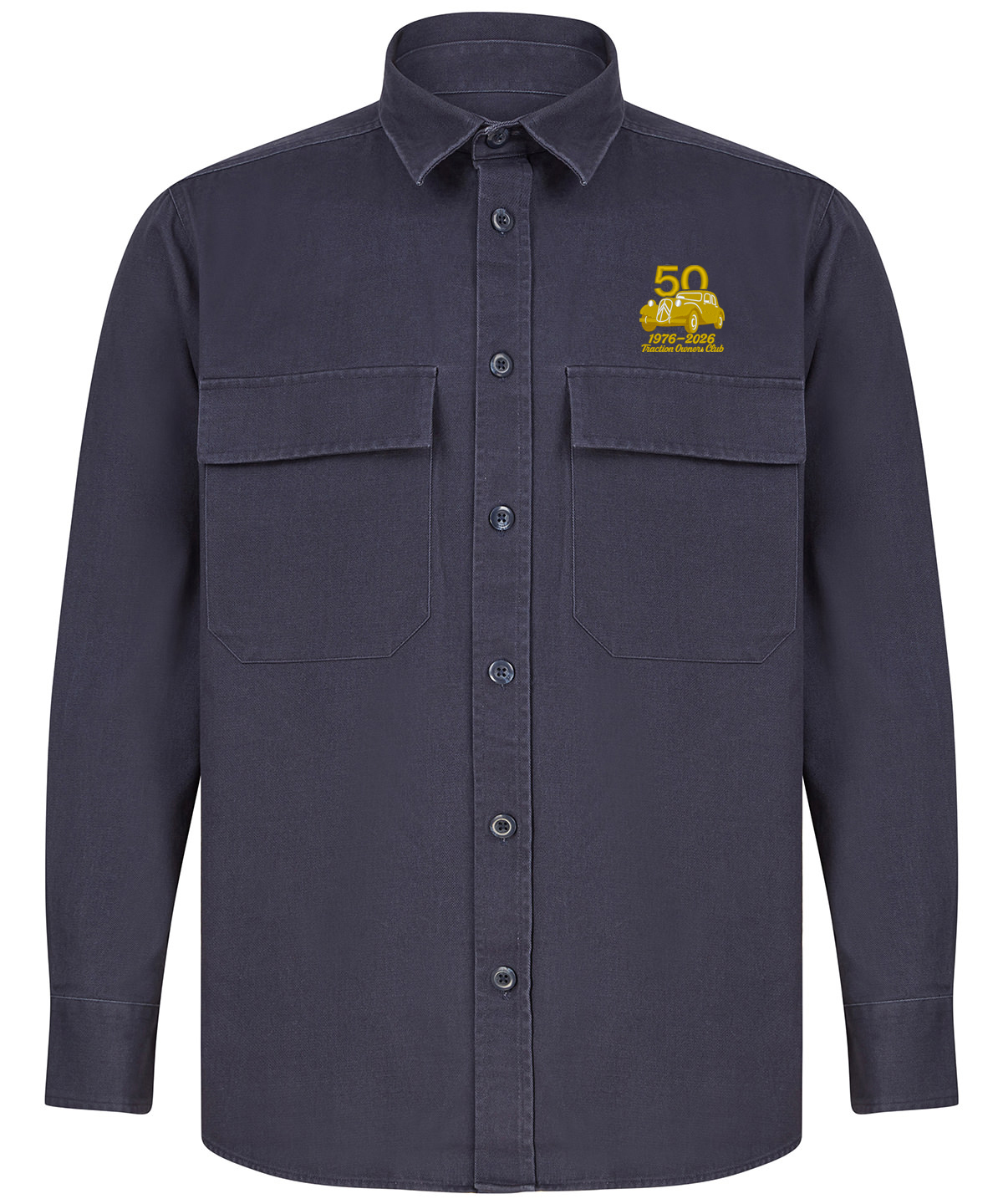 Heavyweight overshirt. Back yoke. Twin-needle topstitching. Plastic horn-effect buttons. Mitred patch pockets with flap. Mitred cuff and placket with button fastening. Curved hem. Forward shoulder seam.