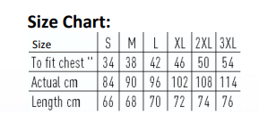 Size: S 34″ M 38″ L 42″ XL 46″ 2XL 50″ 3XL 54″
