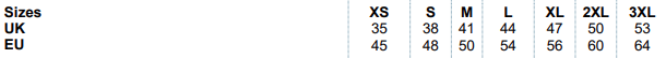 XS, S, M, L, XL, 2XL, 3XL