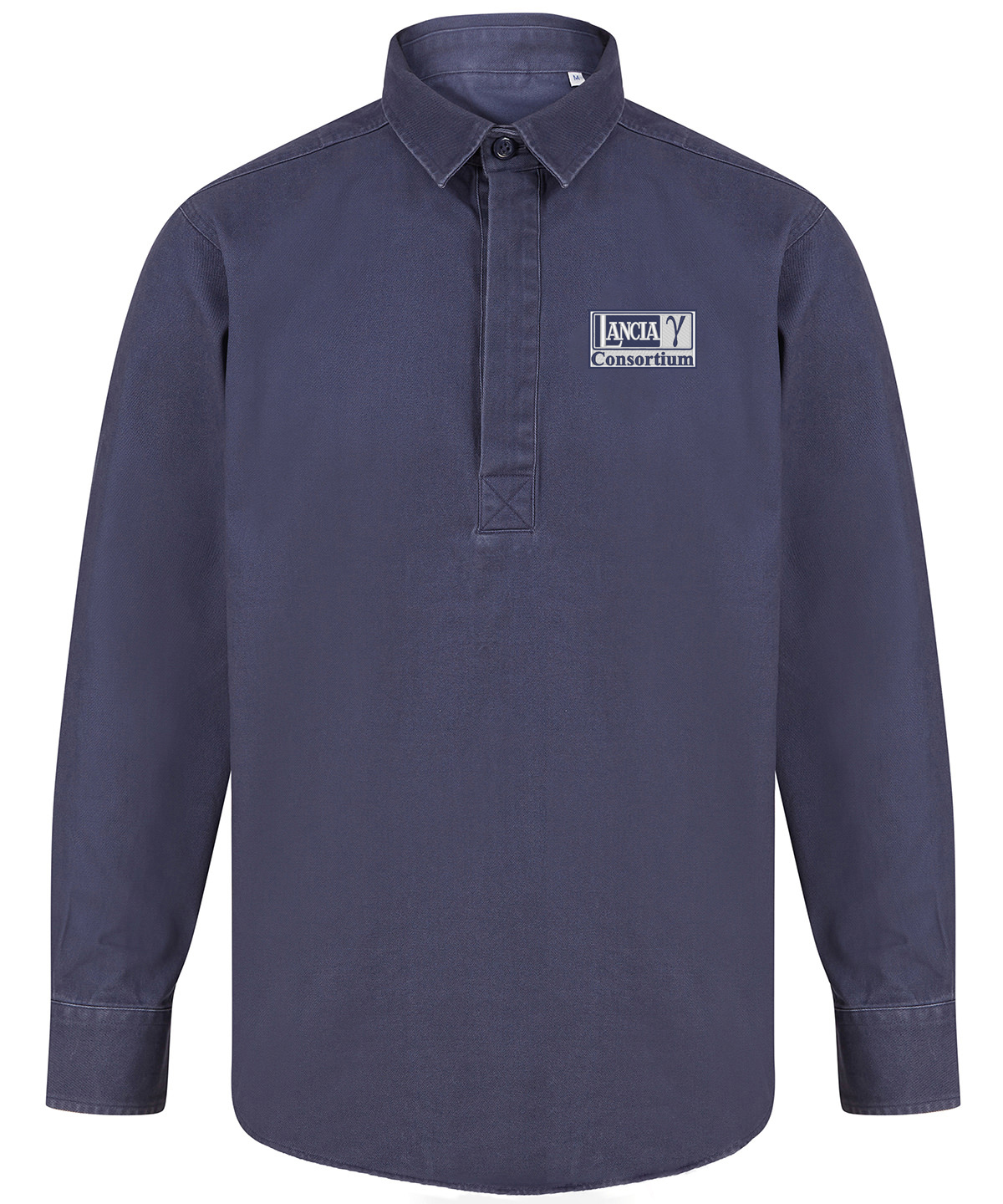 Heavyweight overshirt. Back yoke. Twin-needle topstitching. Plastic horn-effect buttons. Mitred patch pockets with flap. Mitred cuff and placket with button fastening. Curved hem. Forward shoulder seam.